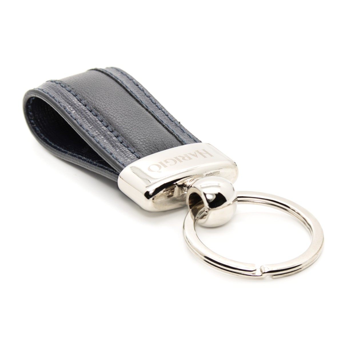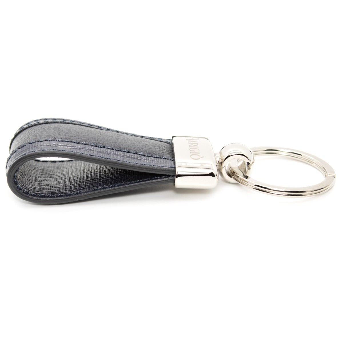 Portachiavi di colore blu notte con un abbinamento di pellame liscio e martellato, la parte liscia ha un anima interna che lo rende morbido, mentre le 2 estremità hanno l'effetto martellato, completo di anello blisè da 36mm misura totale 110mm.