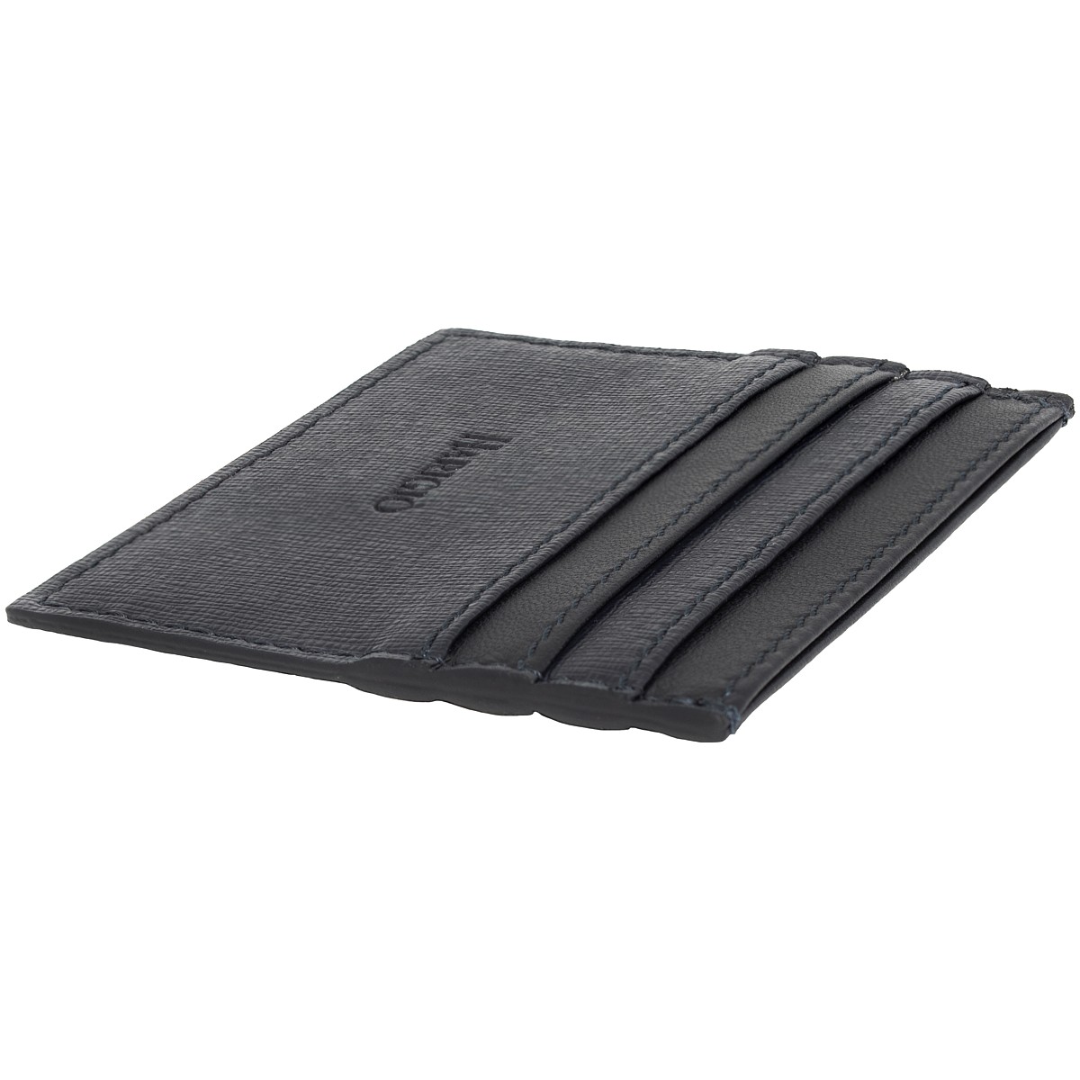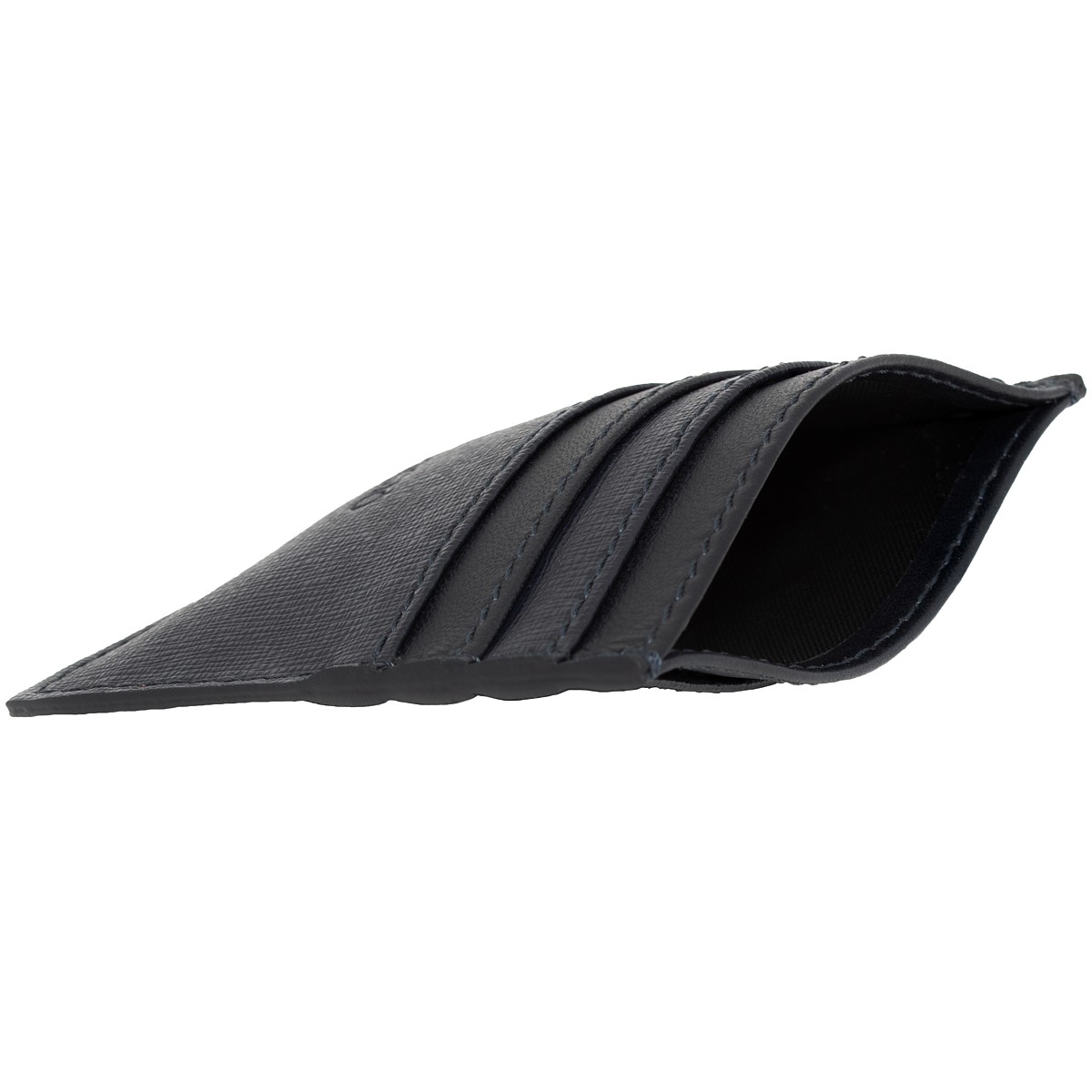 Portacarte di credito di colore blu notte con un abbinamento di pellame liscio e martellato, con 7 tasche di cui 3 anteriori, 3 posteriori e 1 centrale che può essere usata come porta banconote, le misure sono 100mm x 80mm x 8mm utile per carte di credito, documenti, bigliettini e tanto altro.