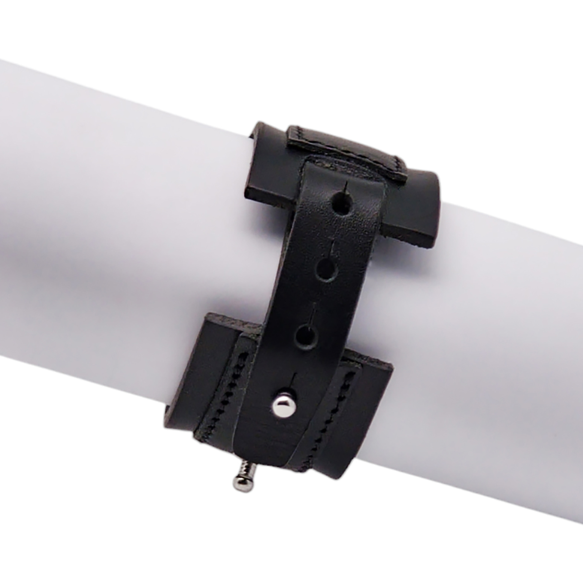 Il bracciale porta una fascia al centro sovrapposto e cucita con filo dello stesso colore, con 2 pomelli e una linguetta a 4 fori per la regolazione della circonferenza polso.