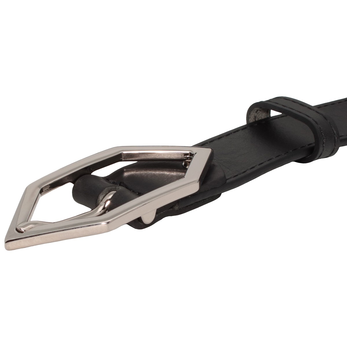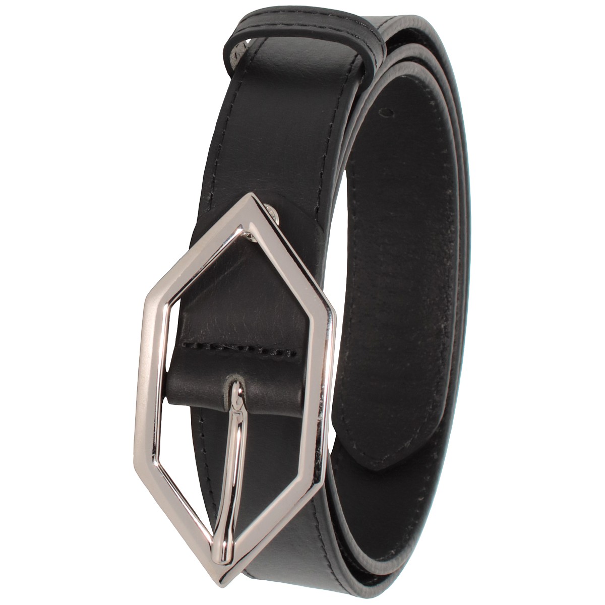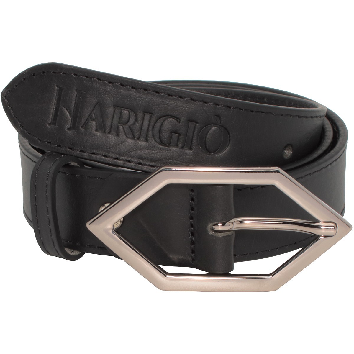 Cintura da donna di colore nero, con timbratura a fuoco del Brand Harigiò sulla punta, cucita a colore con bordi lissati trattati e tinti con le migliori procedure così da rendere un effetto bombato e uniforme, rifinita con una fibbia 8 x 4 Cm. lucida e protetta con trattamento galvanico, questa procedura evita l'invecchiamento e lo scurirsi nel tempo.